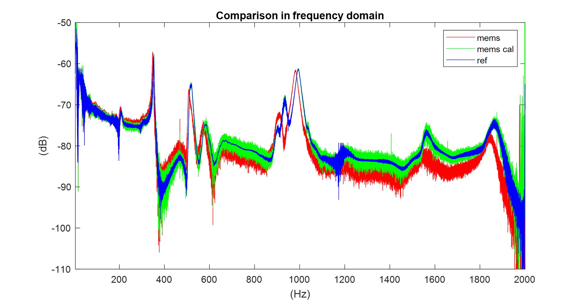There are various methods for quantifying the similarity between curves like those shown in the figures. The most intuitive and direct way is to look at the correlation coefficient of uncalibrated MEMS data and calibrated MEMS data both compared to the reference data.
