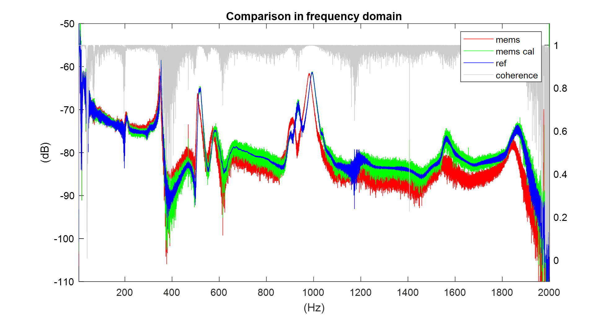 Acceleration curves of MEMS accelerometer and reference accelerometer prior to calibration. Added signal coherence values.