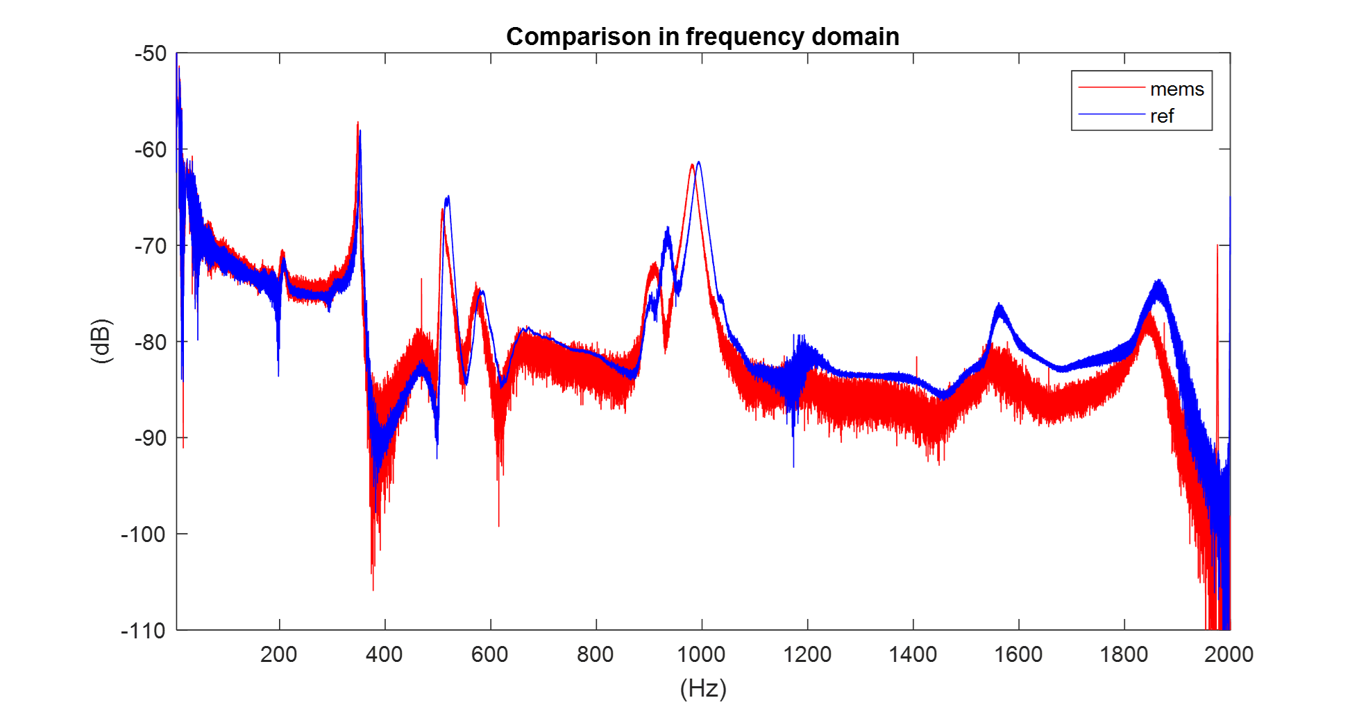 Ignoring the peak occurring at 0 Hz, which is attributable to the DC-Offset in sensor positioning along the gravity vector, a slight difference in the intensity of the excitation appears in the second half of the bandwidth. Here, the red MEMS curve is found to be below the level of the blue reference curve. This discrepancy can be corrected in the calibration process.
