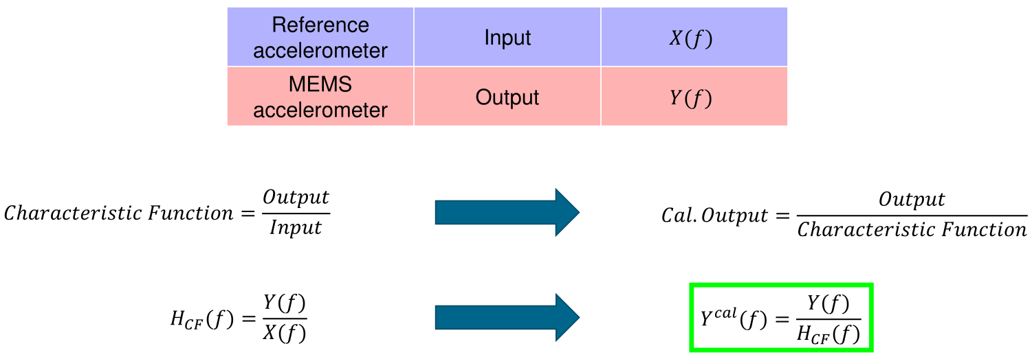 Assigning the role of input to the calibrated reference accelerometer and the role of output to the MEMS accelerometer makes it possible to estimate, through the transfer function, the deviation of the uncalibrated MEMS accelerometer from the calibrated data. The inverse of this quantity can be applied to the MEMS data to achieve calibrated data. The characteristic function is calculated by dividing the output by the input. This is displayed qualitatively below.