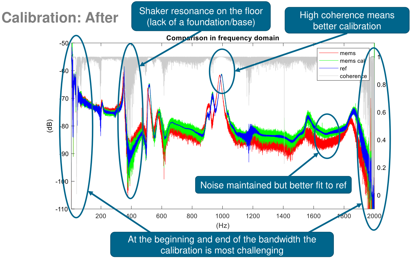 After calibration, the green curve follows the blue reference curve much more closely across the entire frequency range, providing data that is more consistent with that of the reference accelerometer. Obviously, the noisier characteristic is maintained, as that is in the nature of the MEMS sensor, but the better fit to the reference data is significant.