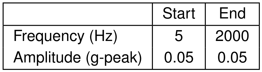 For this test, a Chirped-Sine excitation was programmed in VibrationVIEW. The following table shows the two most important parameters selected for this test.