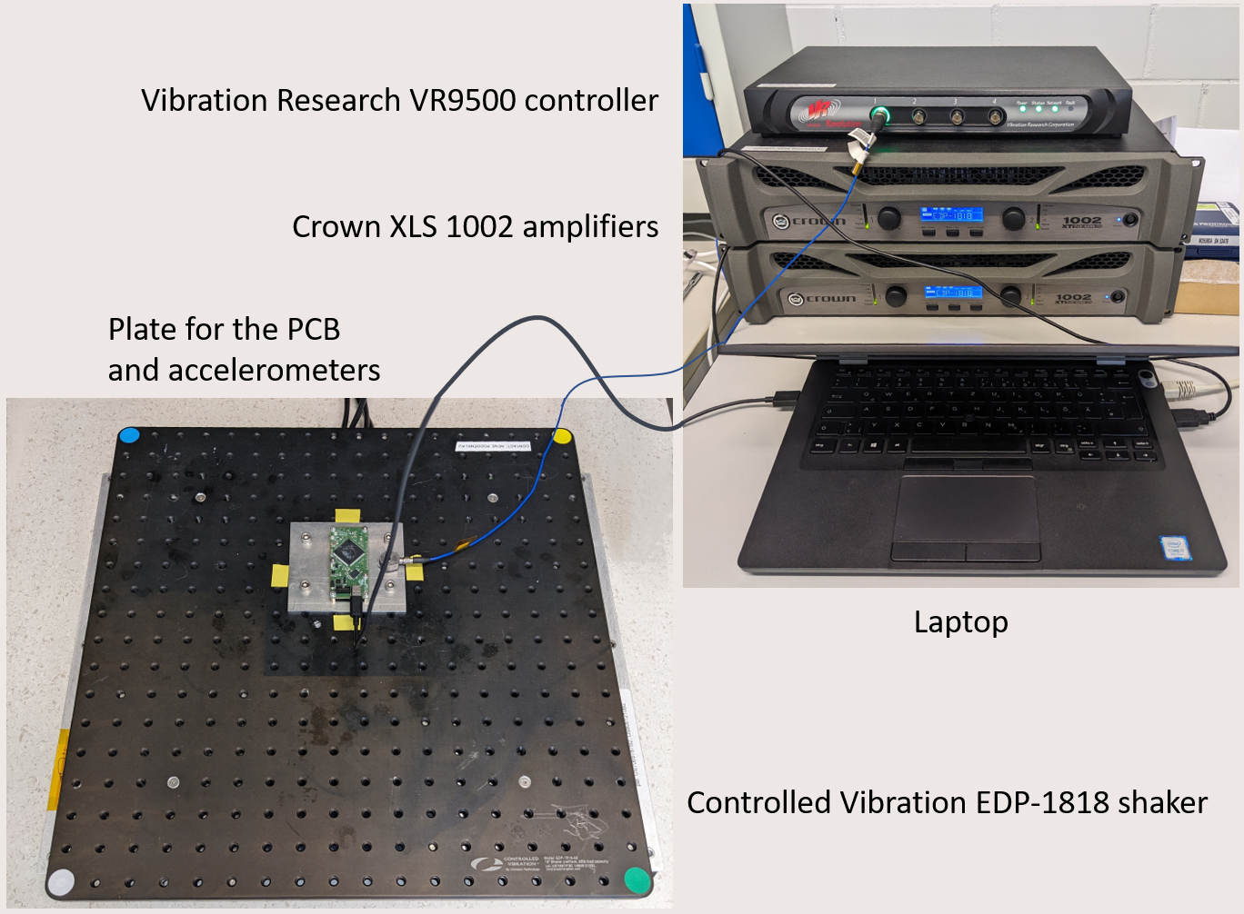 The setup for the experiments. Top right, the VR9500 controller on top of the Crown XLS 1002 power amplifiers with the laptop used for the test recordings. Bottom left, the Controlled Vibration EDP-1818 shaker. Mounted on it is the realized plate for mounting the MAC PCB and the reference accelerometer.