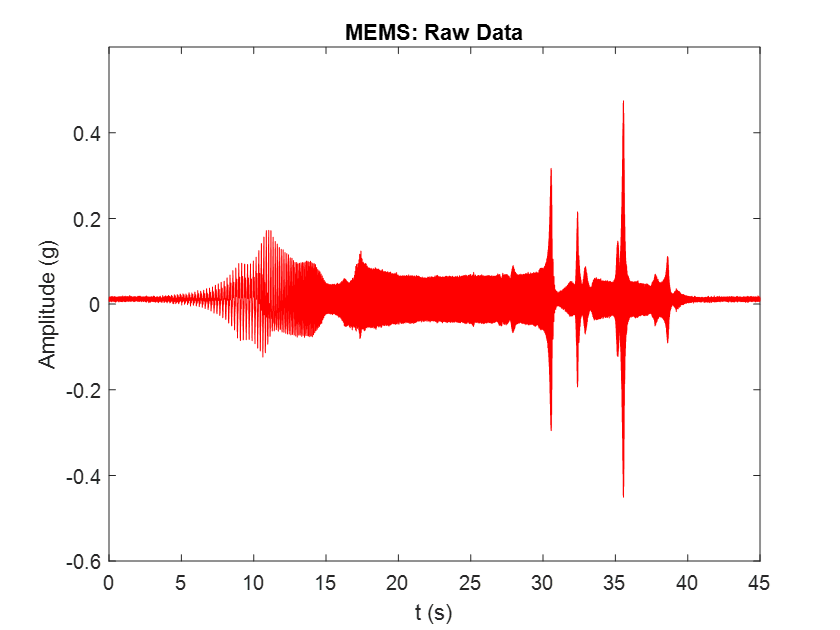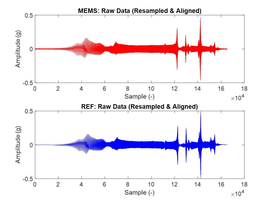 The figures below show the time-domain acceleration outputs generated by the reference and MEMS sensors without any signal processing.