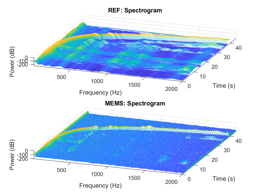 On the left: Power Spectrum 2D plots for reference and MEMS accelerometers showing the chirp sinusoidal power response over the frequency and time. On the right: Power Spectrum 3D plots for reference and MEMS accelerometers showing the chirp sinusoidal power response over the frequency and time.