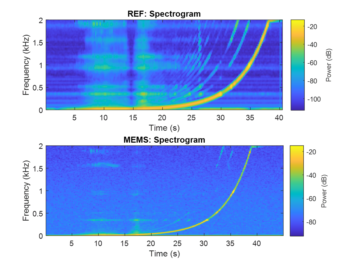 The power curve resulting from a logarithmic sweep rate is clearly visible in both plots for both sensors and aligns with the selected parameter of 18 octaves per minute (oct/min), as mentioned above. The reference accelerometer’s lower signal noise is evident in the darker blue shades in the image, when compared to the MEMS signal. This is to be expected, as MEMS accelerometers are known to have a higher noise-to-signal ratio than more expensive, larger alternatives. These plots also highlight the need for signal alignment for the upcoming sensor calibration, as can be seen by looking at the time axis and the progression of the power curves.