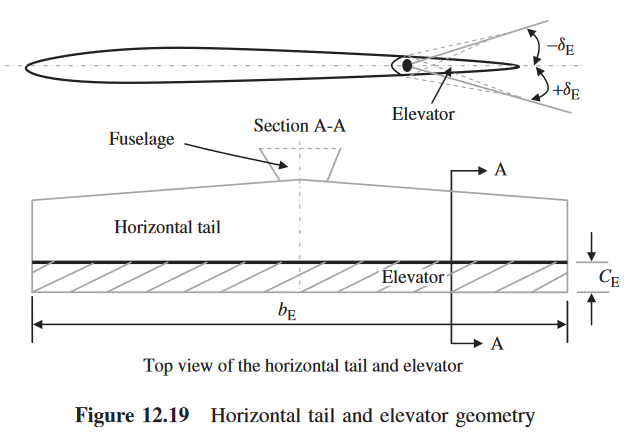 - aircraft response to the pilot input In the design of the elevator, four parameters should be determined. 1) elevator planform area (S_E) 2) elevator chord (C_E) 3) elevator span (b_E) 4) maximum elevator deflection (±δ_Emax)