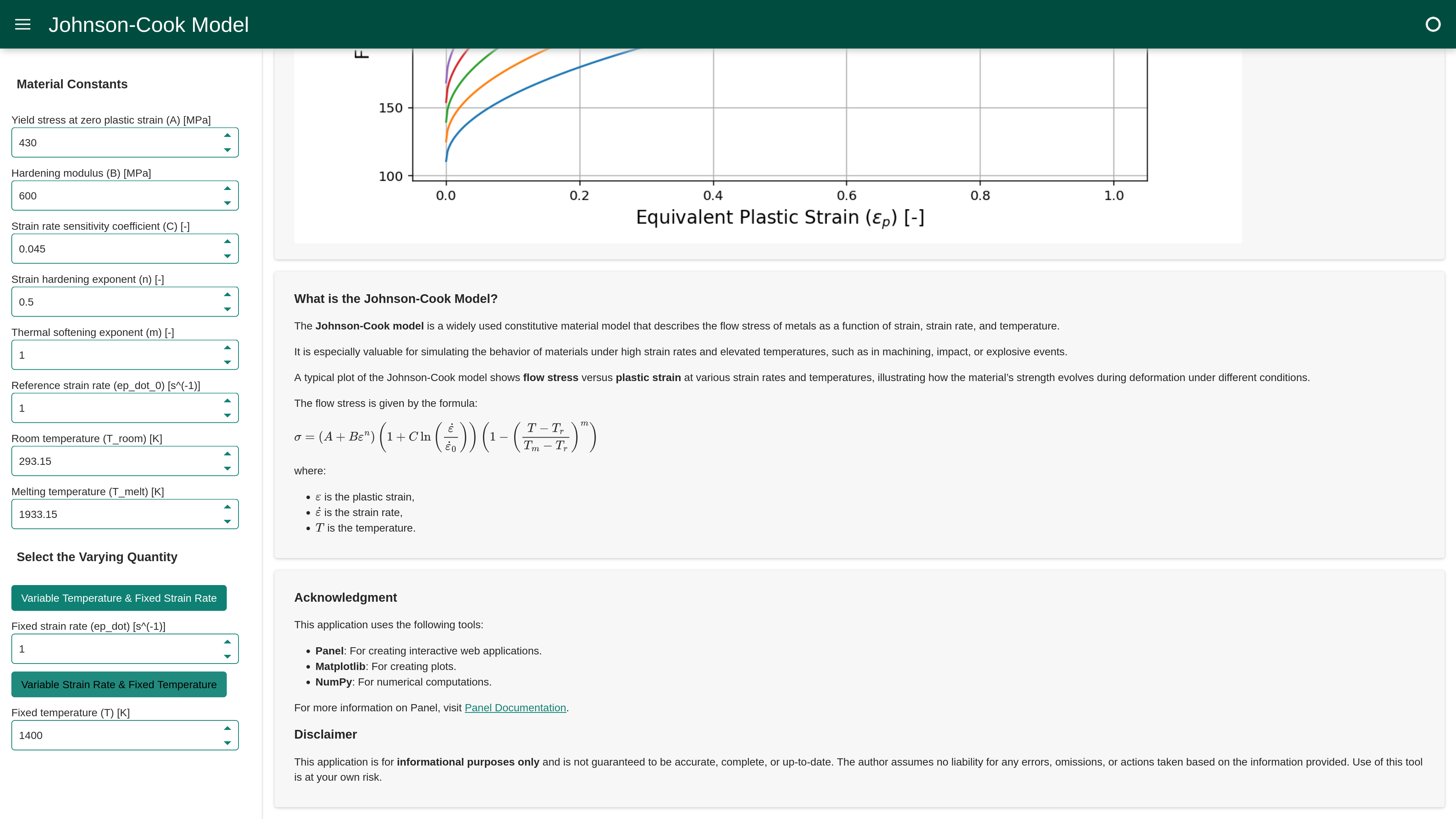 The main section has three panels. The actual plot takes center stage. Below, there is a brief summary of the Johnson-Cook model, along with its equation. The last section serves as an acknowledgment and disclaimer, mentioning the tools used.